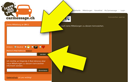 Gib das Kennzeichen, für welches du eine Mitteilung hinterlassen willst, im Orangen Bereich auf der linken Seite ein, und klicke auf "weiter".